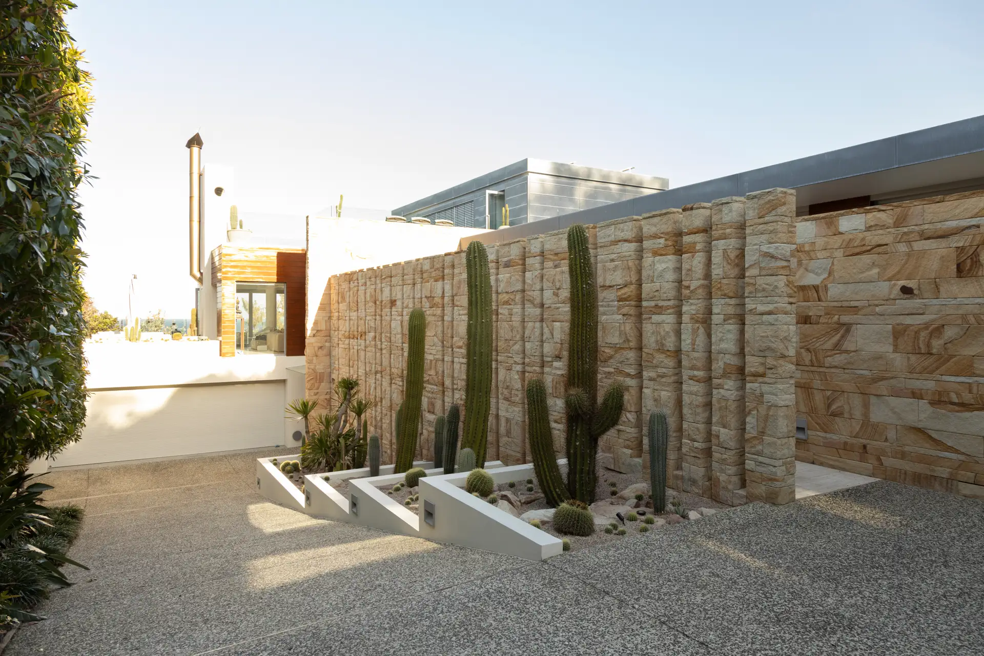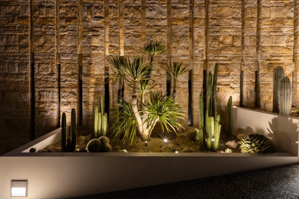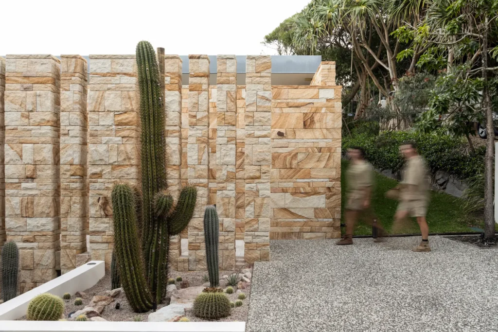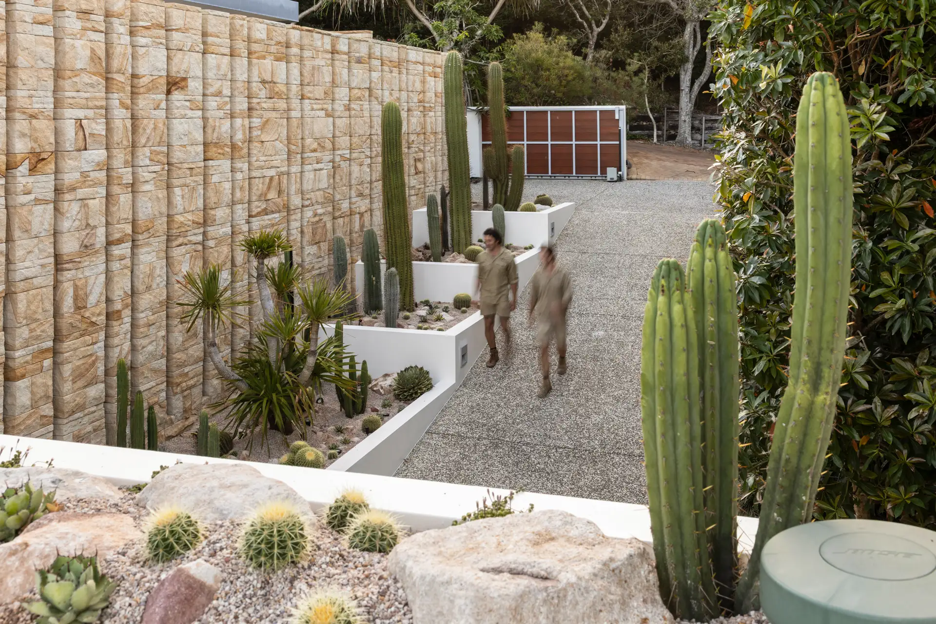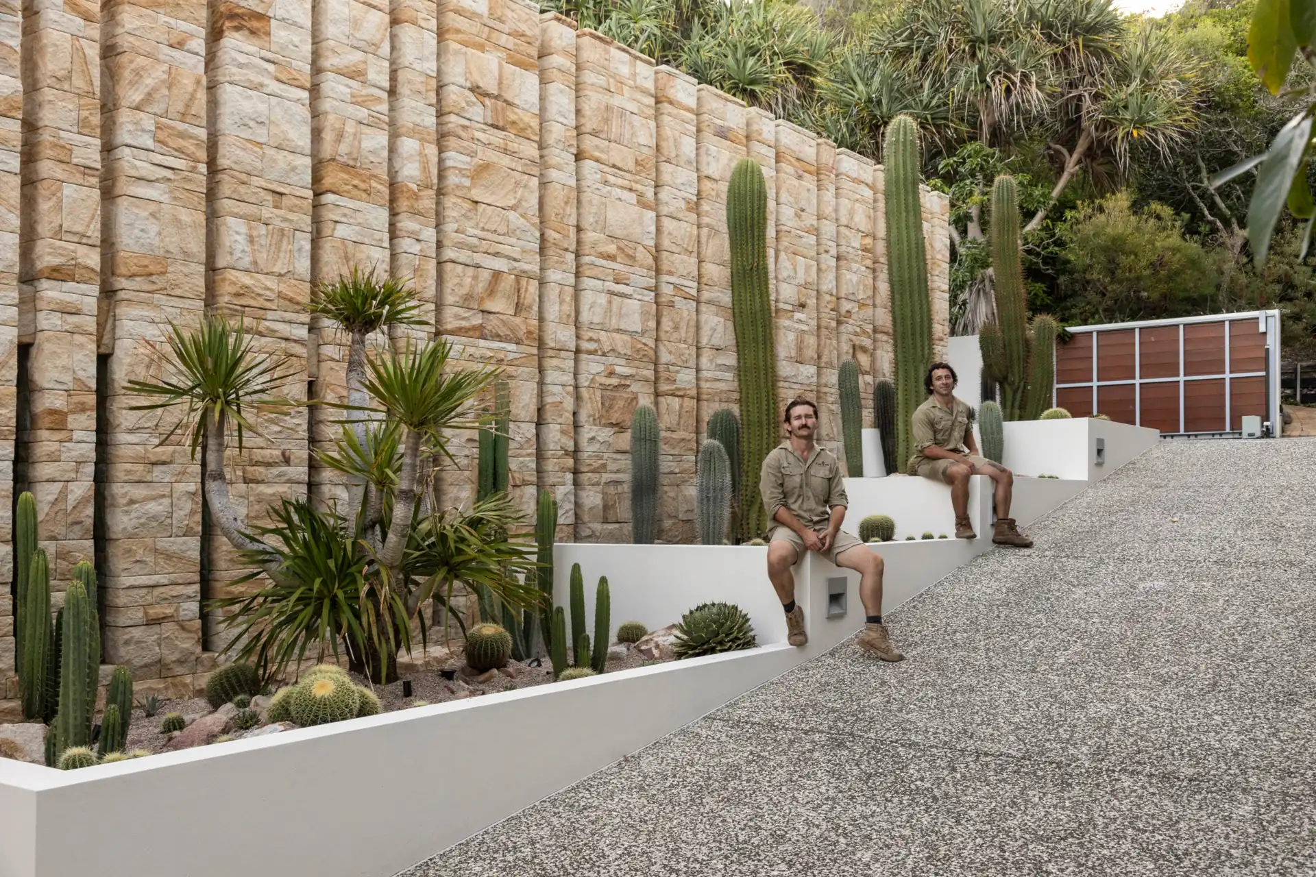From the moment you enter the gates you are struck by the awe-inspiring sight of three 30-year-old Argentinian Saguaros (Echinopsis terscheckii) standing proud against an incredible 5 metre tall sandstone feature wall. Each one of these plants was transported over 400km by our team and skilfully installed with the assistance of a crane, each one weighing approximately 700-1000kg.