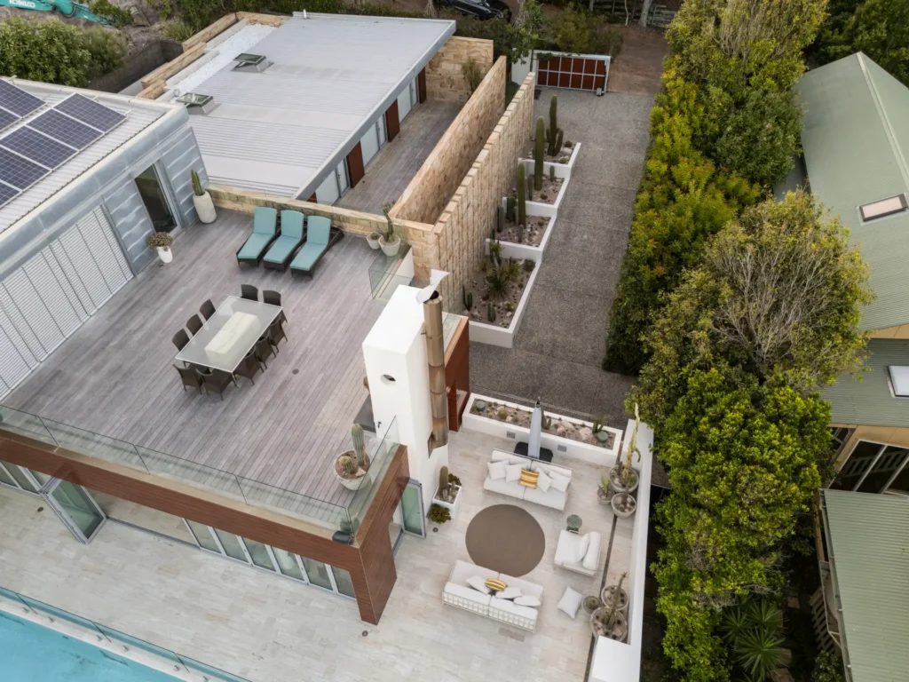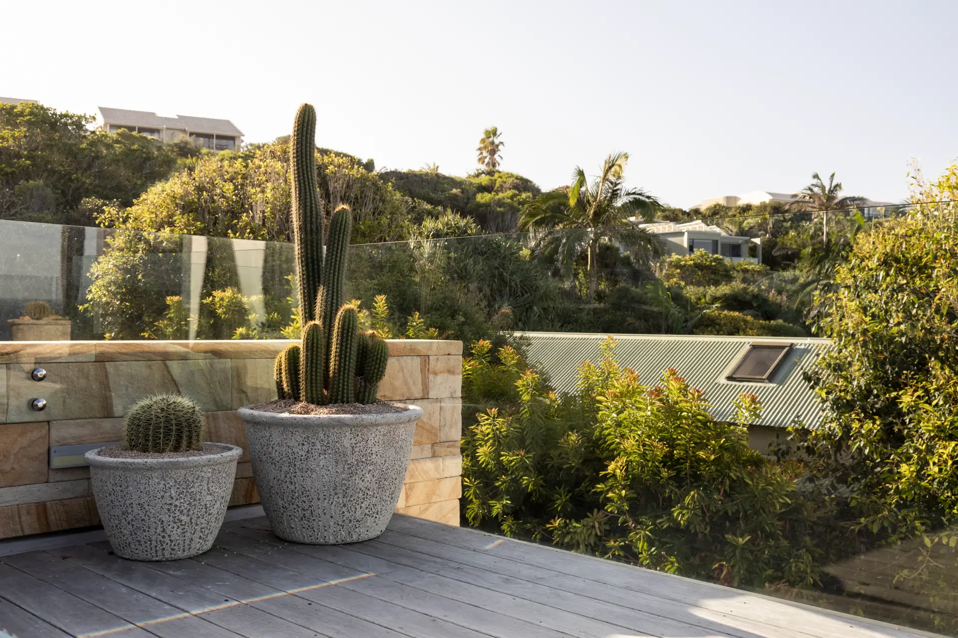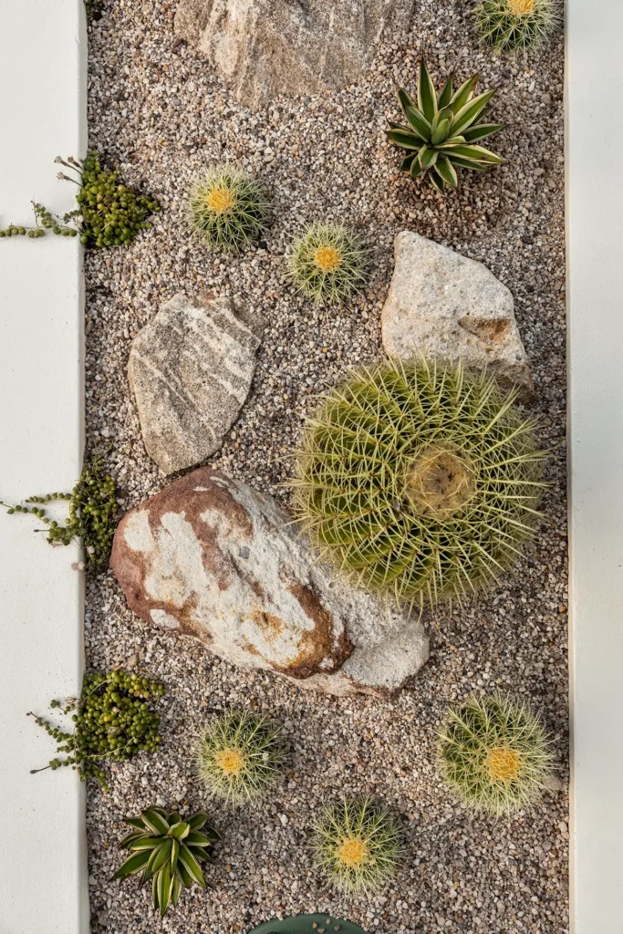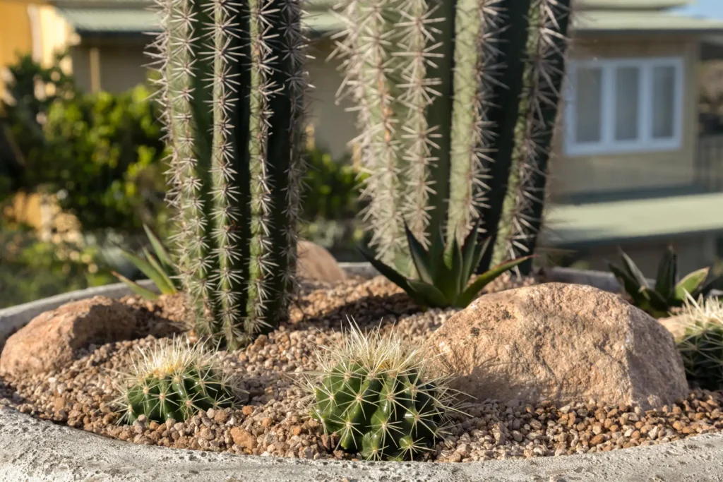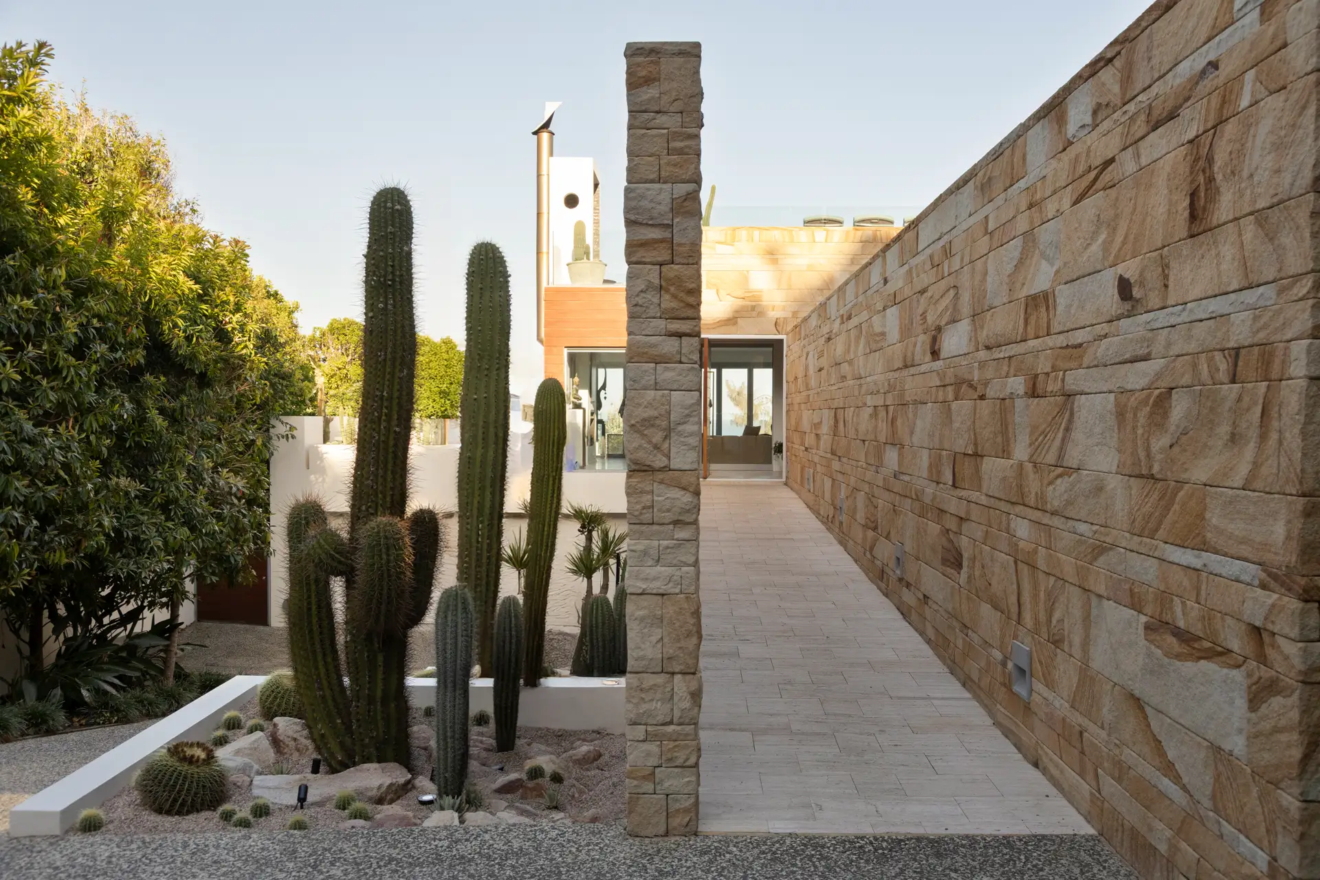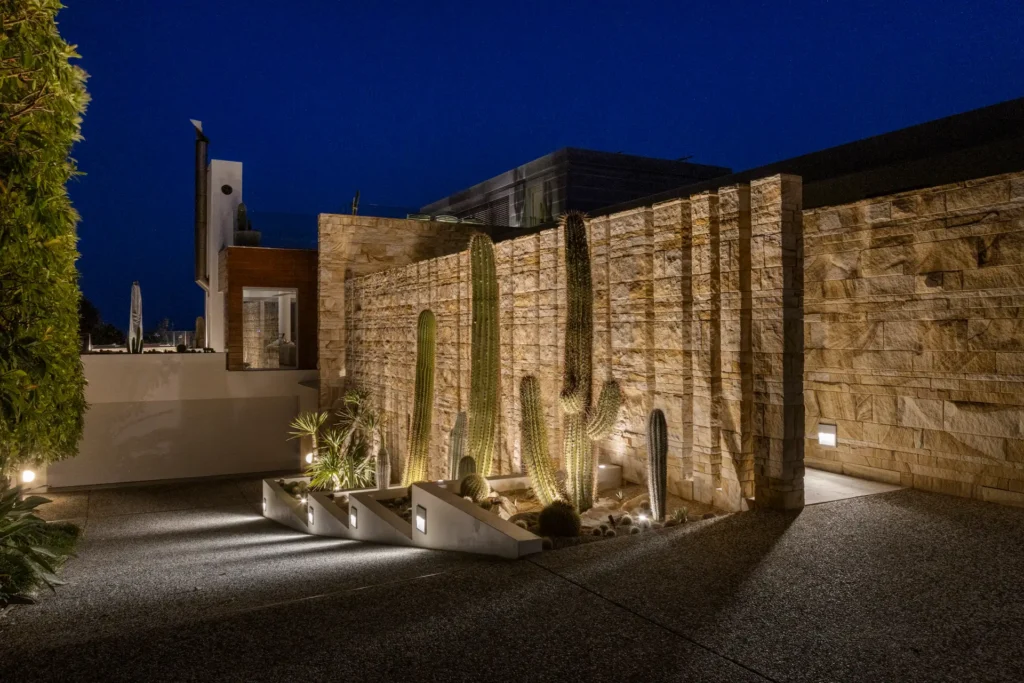 From the moment you enter the gates you are struck by the awe-inspiring sight of three 30-year-old Argentinian Saguaros (Echinopsis terscheckii) standing proud against an incredible 5 metre tall sandstone feature wall. Each one of these plants was transported over 400km by our team and skilfully installed with the assistance of a crane, each one weighing approximately 700-1000kg.