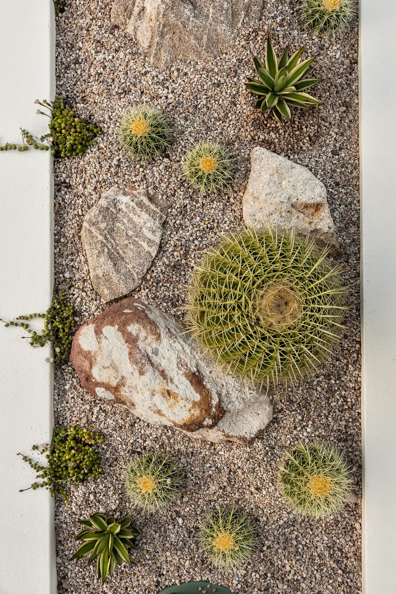 The ground level is exploding with dozens of cacti including columnar varietes such as San Pedros and Pachycereus pringlei. Too many Golden Barrels to count, and agaves of all different shapes of sizes, leading down to a beautiful feature Vietnamese Dragon Tree.