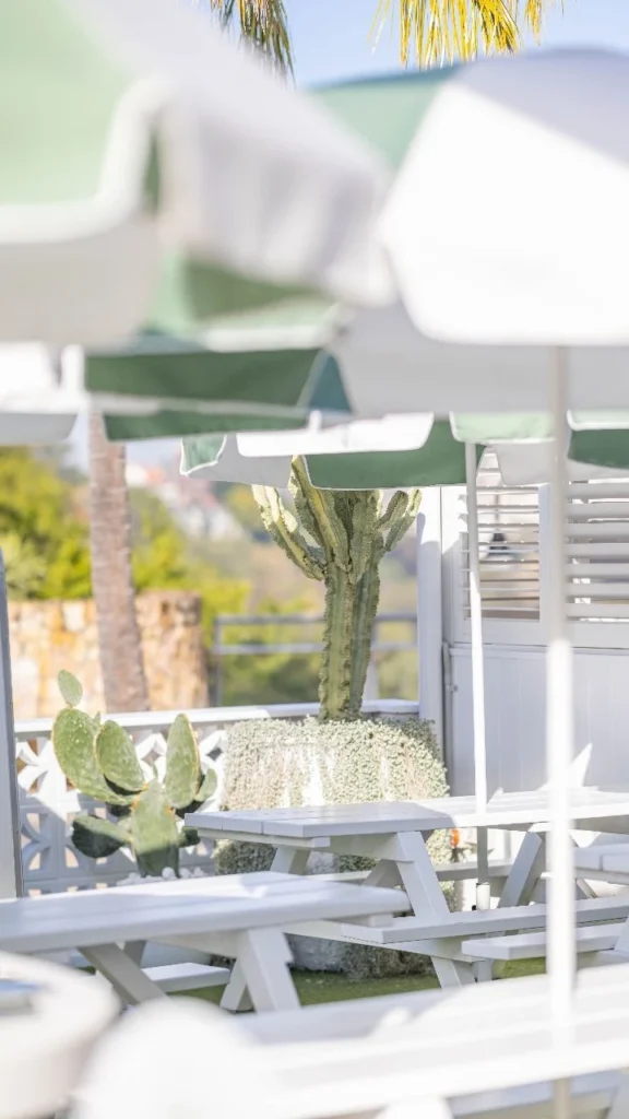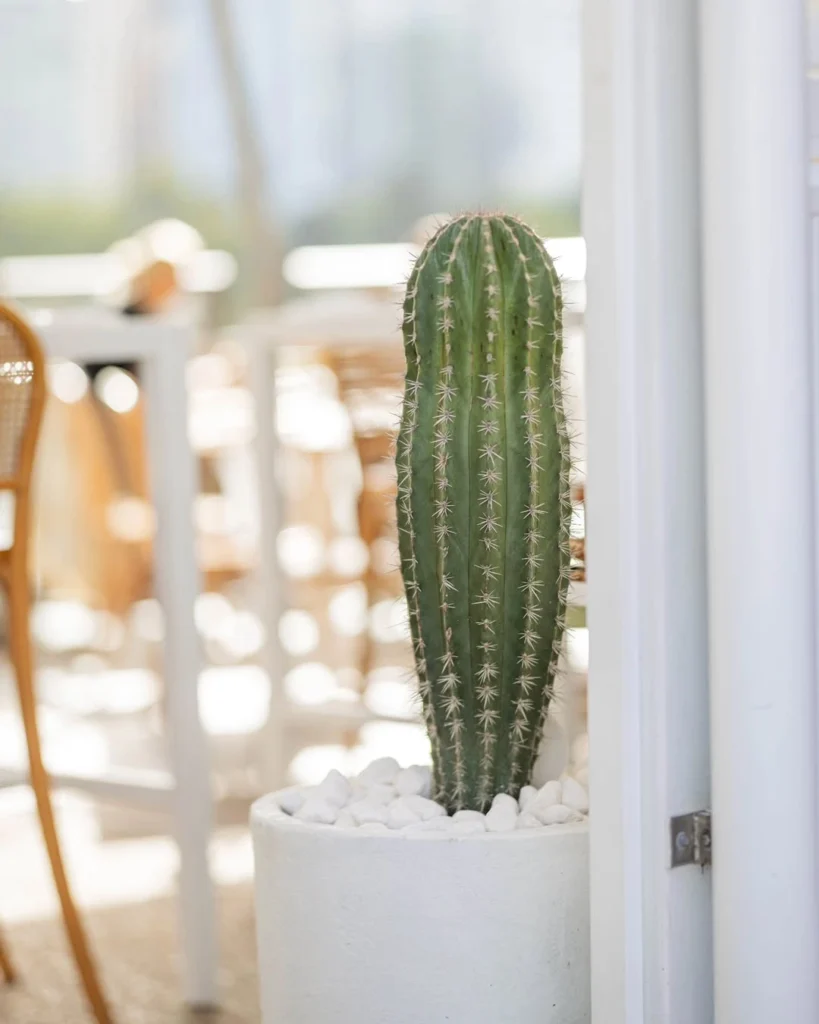The variety of pot sizes and forms were carefully matched to each plant’s distinct architecture. The result is a striking blend of sculptural desert forms and lush trailing greenery that enhances Joey’s vibrant, relaxed atmosphere and complements its panoramic river views.
