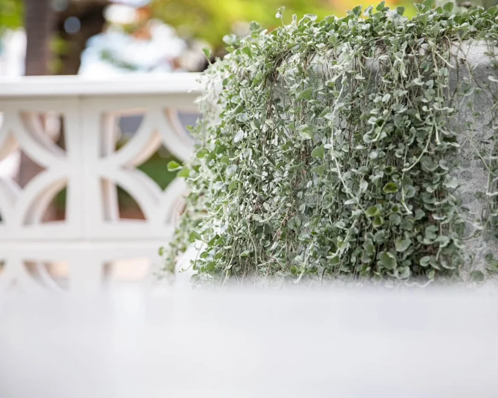 To soften the composition, we incorporated Silver Falls (Dichondra argentea), adding a cascading silvery-green contrast to the clean, white planters.