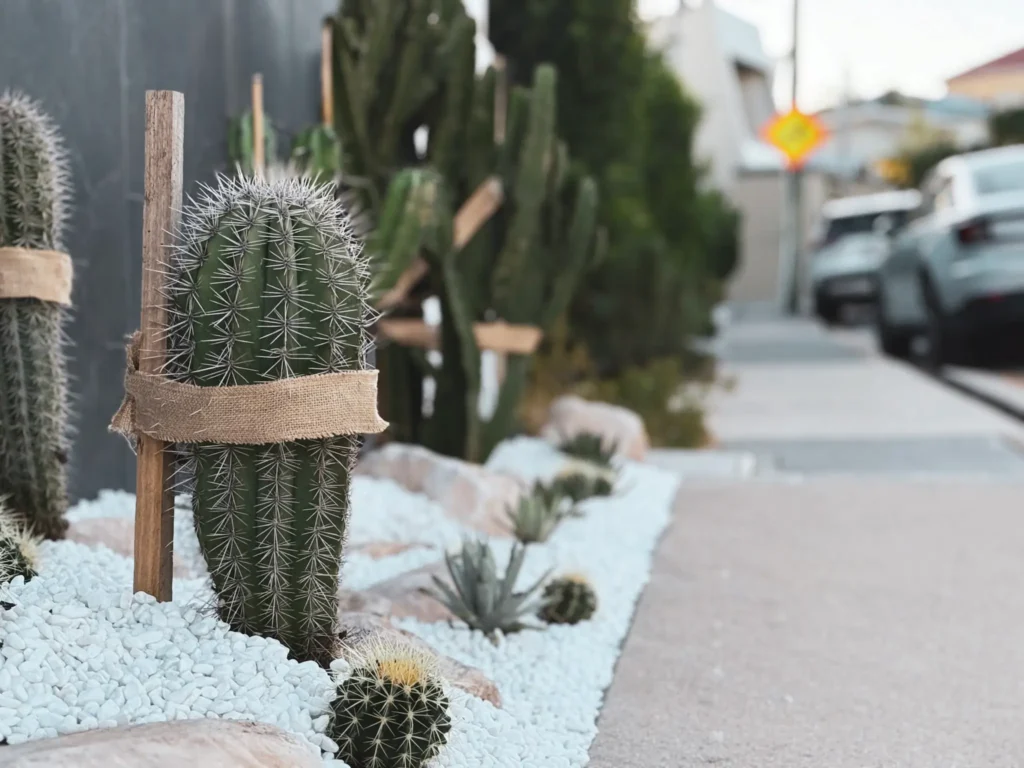 We leaned into a palm springs-inspired palette, combining a clean foundation of white pebble with carefully curated specimen Cacti, architectural Euphorbias and premium Agaves. Each plant was selected for its unique silhouette and visual weight, ensuring balance against the strong geometry of the façade.